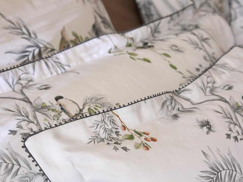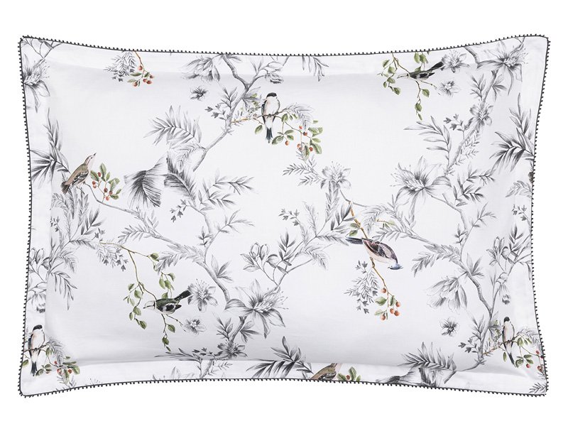 Die wunderschöne Wendebettwäsche CHARME von Alexandre Turpault zeigt ein florales Muster aus Beerenzweigen und detailliert gezeichneten Vögeln auf schneeweißem Untergrund.