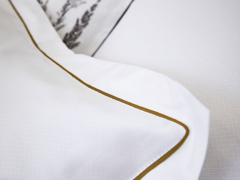Diese reinweiße Luxusbettwäsche ORSAY von ALEXANDRE TURPAULT überzeugt durch den samtweichen und glänzenden Satin aus hochwertigster Bio-Baumwolle und dem klasischen Jacquardmuster in Guilloché-Optik. Was diese Bettwäsche aber so ganz besonders macht, ist die Individualisierbarkeit durch die Auswahl an 18 tollen Farben für die umlaufenden Satinpaspelierung an Kissen- und Bettbezug und/oder Bettlaken. Von leuchtendem, wertvollem Gold über kühle Graunuancen bis hin zu feurigen und warmen Rottönen ist sicherlich für jeden die persönliche Lieblingsfarbe dabei!