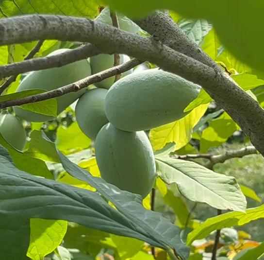 Frucht: Die PawPaw (Indianerbanane) ist die größte in Amerika heimische Frucht. Der Ertrag setzt, je nach Lage nach etwa drei bis bis sechs Jahren ein. Bei einem größeren Strauch können durchaus einige Kilogramm Frucht geerntet werden. Das Fruchtgewicht liegt zwischen 60 und 250 g, ausnahmsweise auch mehr. Die Wildformen tragen meist mehrere bohnengroße Samen als die gezüchteten Sorten. Zwischen 8 und 14 Samen finden sich in einer Frucht.