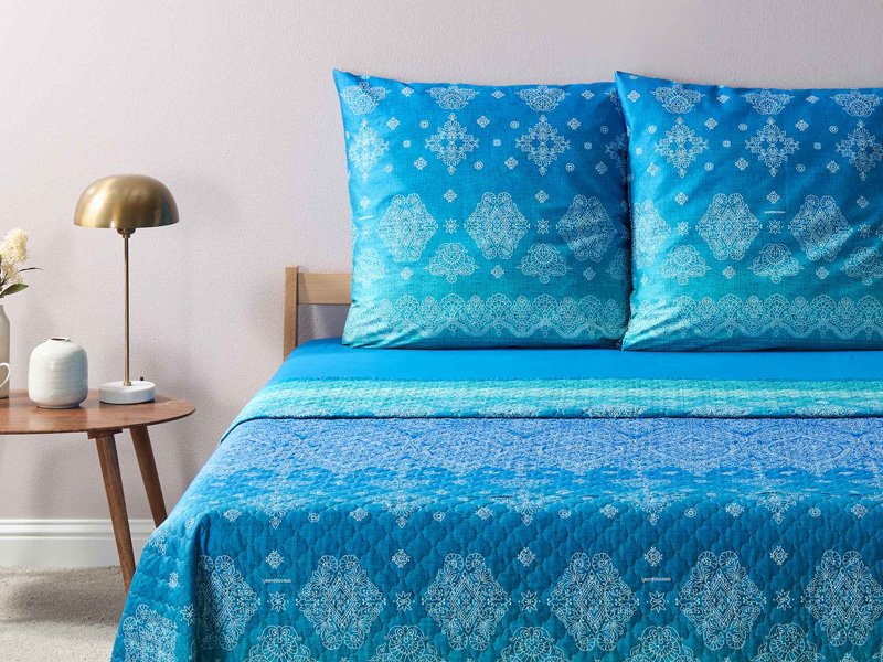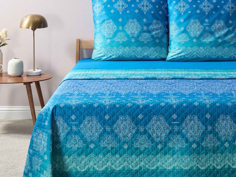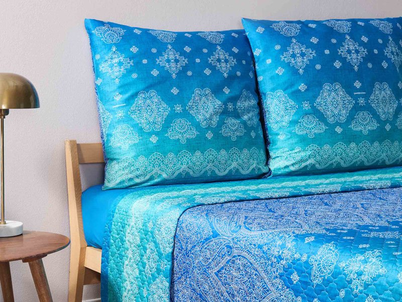 Die Tagesdecke KERALA B1 gibt es in vier Größen. Gefertigt werden diese aus 1oo% Baumwolle, die Füllung ist aus Polyester. Die gesteppten Bettüberwürfe sind bis 40 Grad waschbar und auch trocknergeeignet. Durch die Verwendung eines hochwertigen Drucks behalten die Farben ihre Intensität und bleichen nicht aus. Somit sind alle Voraussetzungen für eine ansprechende Tagesdecke für Ihr wundervoll dekoriertes Bett gegeben…