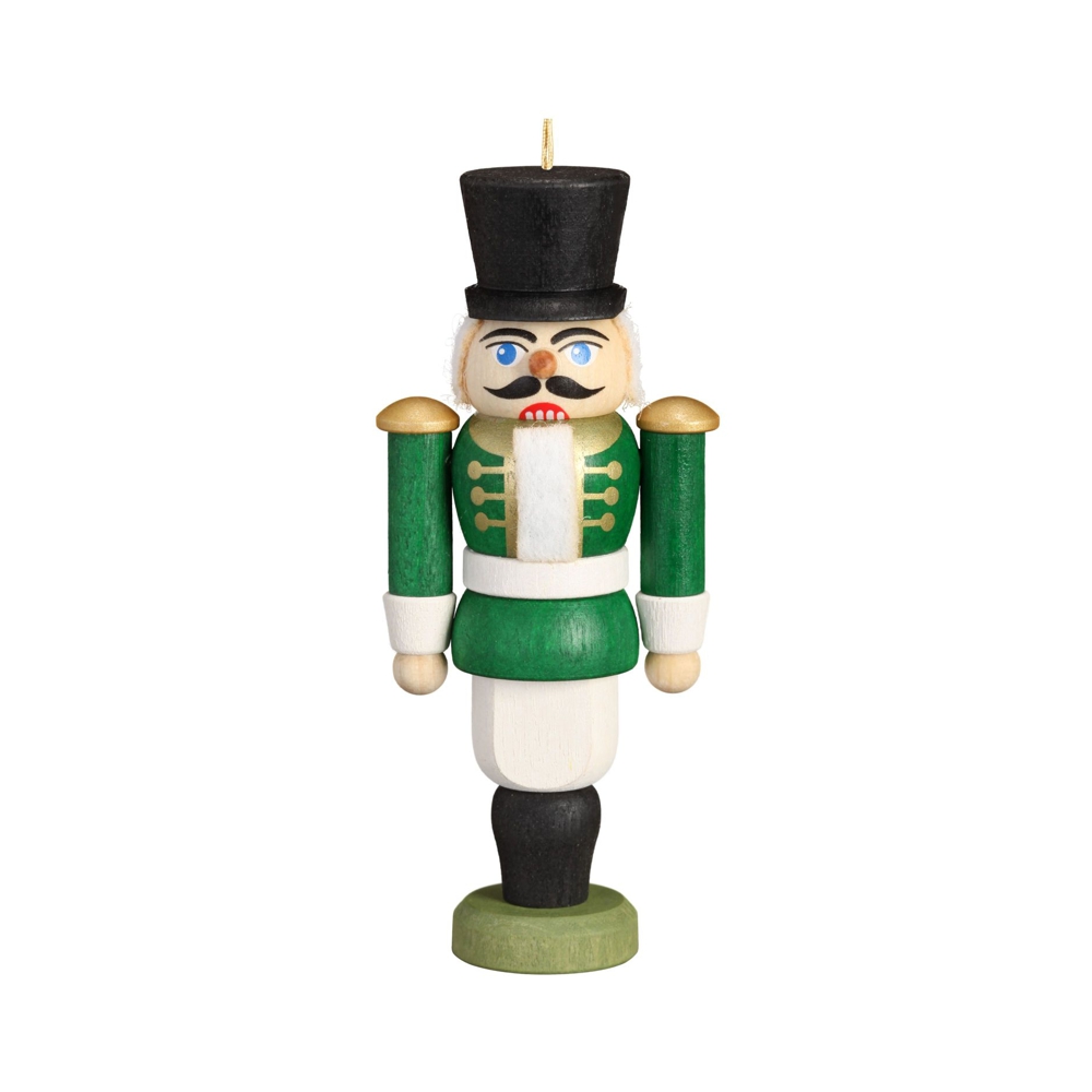 Der in kräftigen Farben bemalte Miniatur Nussknacker steht aufrecht und blickt geradeaus. Seine schicke grüne Uniform schmückt er mit goldenen Verzierungen, und er trägt stolz einen schwarzen Hut. Trotz seiner geringen Größe von nur 9 cm erzeugt er eine imposante Erscheinung und zieht die Blicke auf sich.