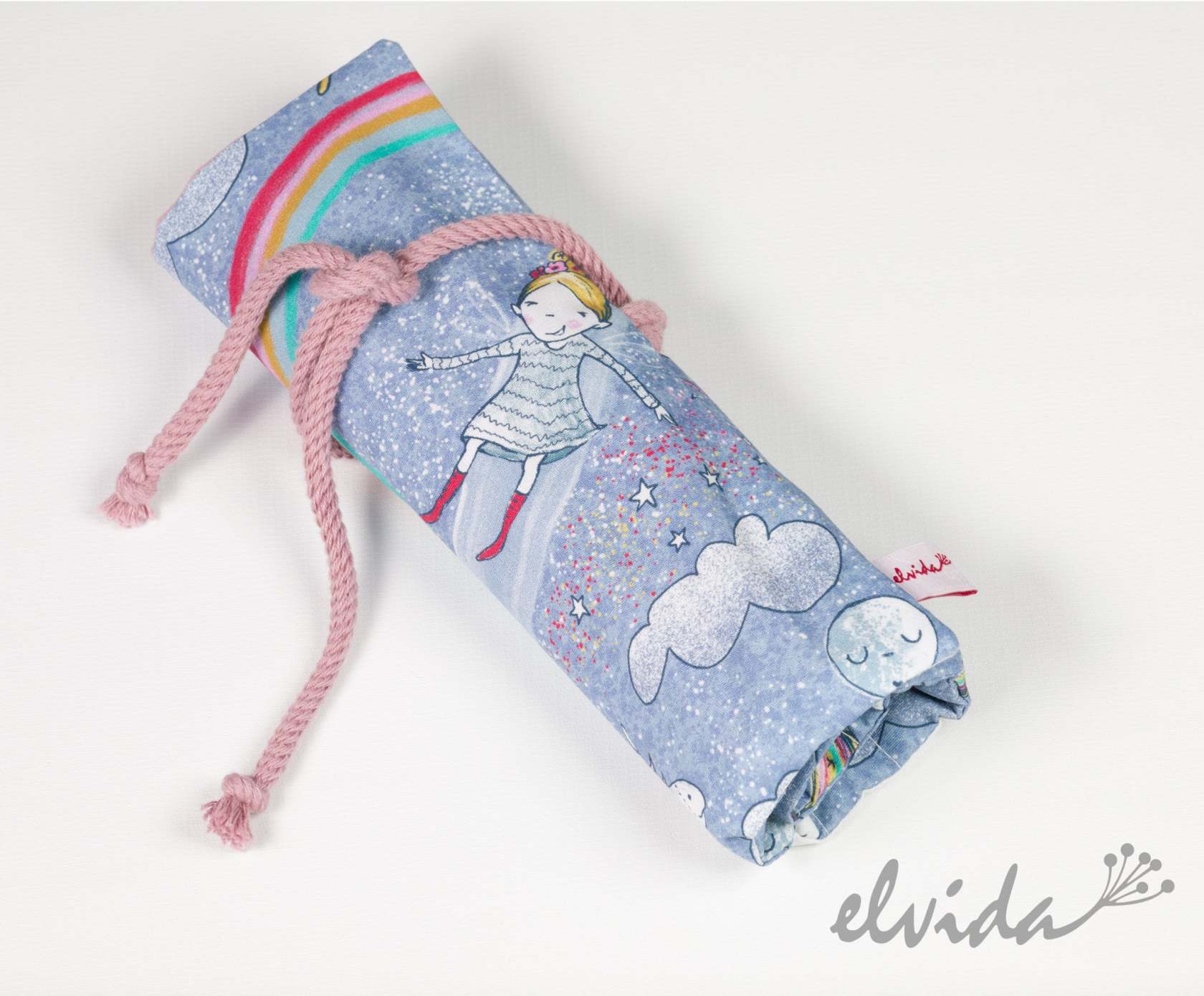 Sie wurde mit sehr schönen Stoffen kombiniert und kann nach dem Zusammenrollen an einem Bändchen befestigt werden.