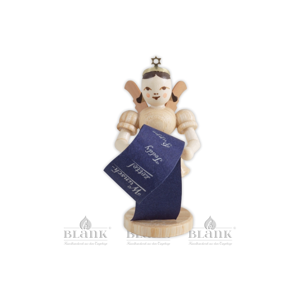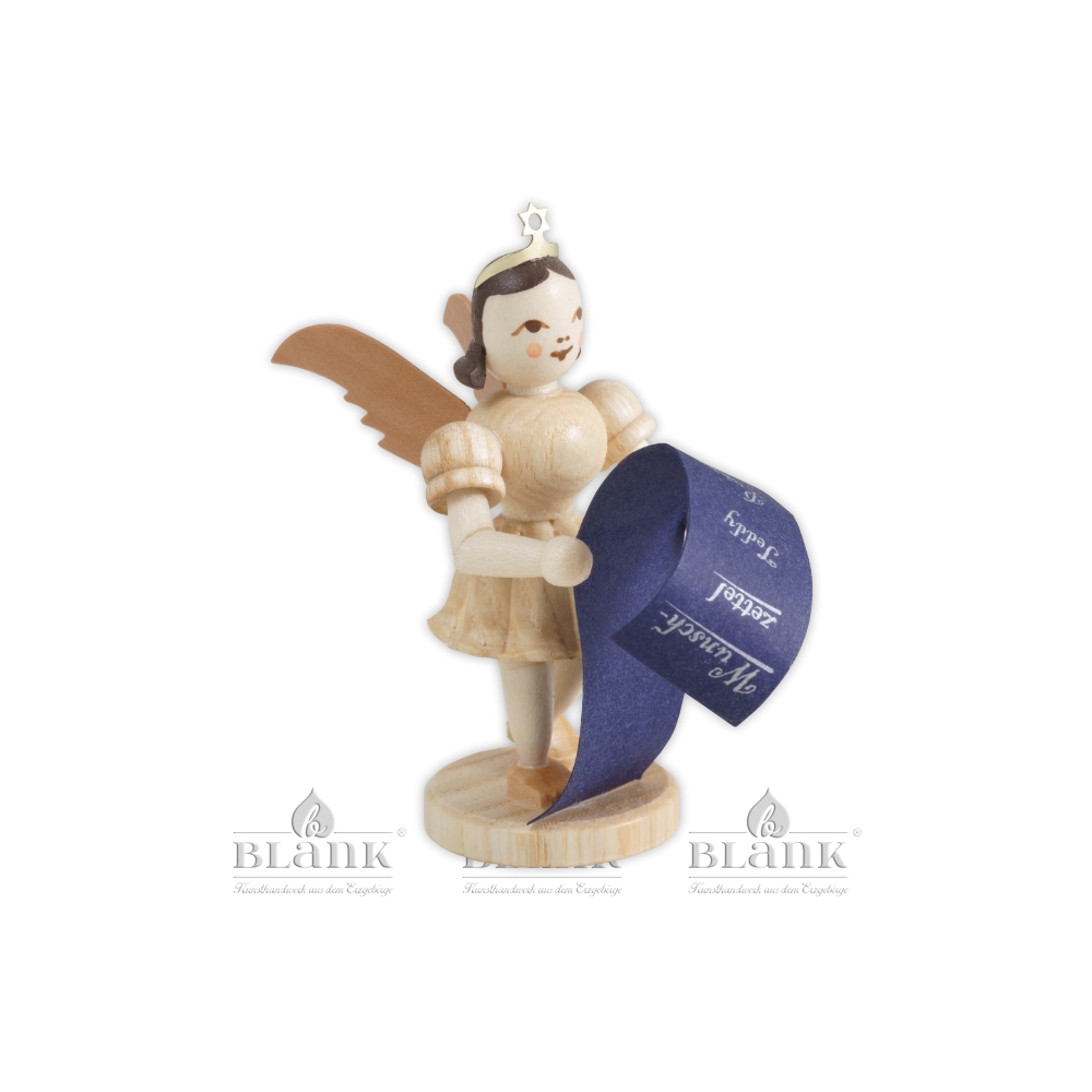 In Händen hält der kleine Engel mit dem freundlichen Gesicht einen langen, blauen Wunschzettel auf dem mit silbernen Stift fein säuberlich alle weihnachtswünsche stehen.