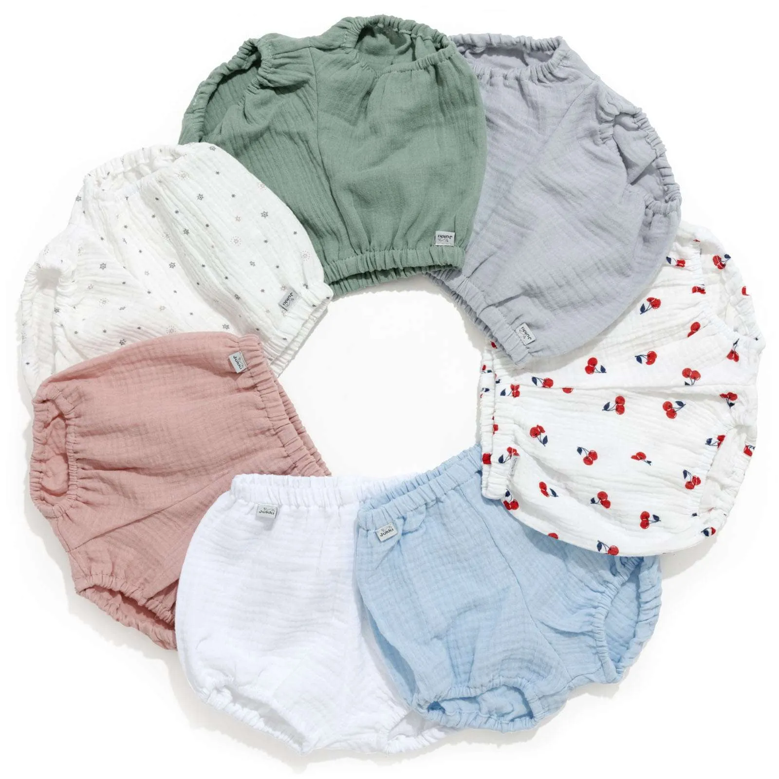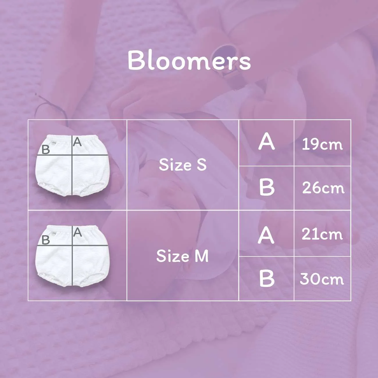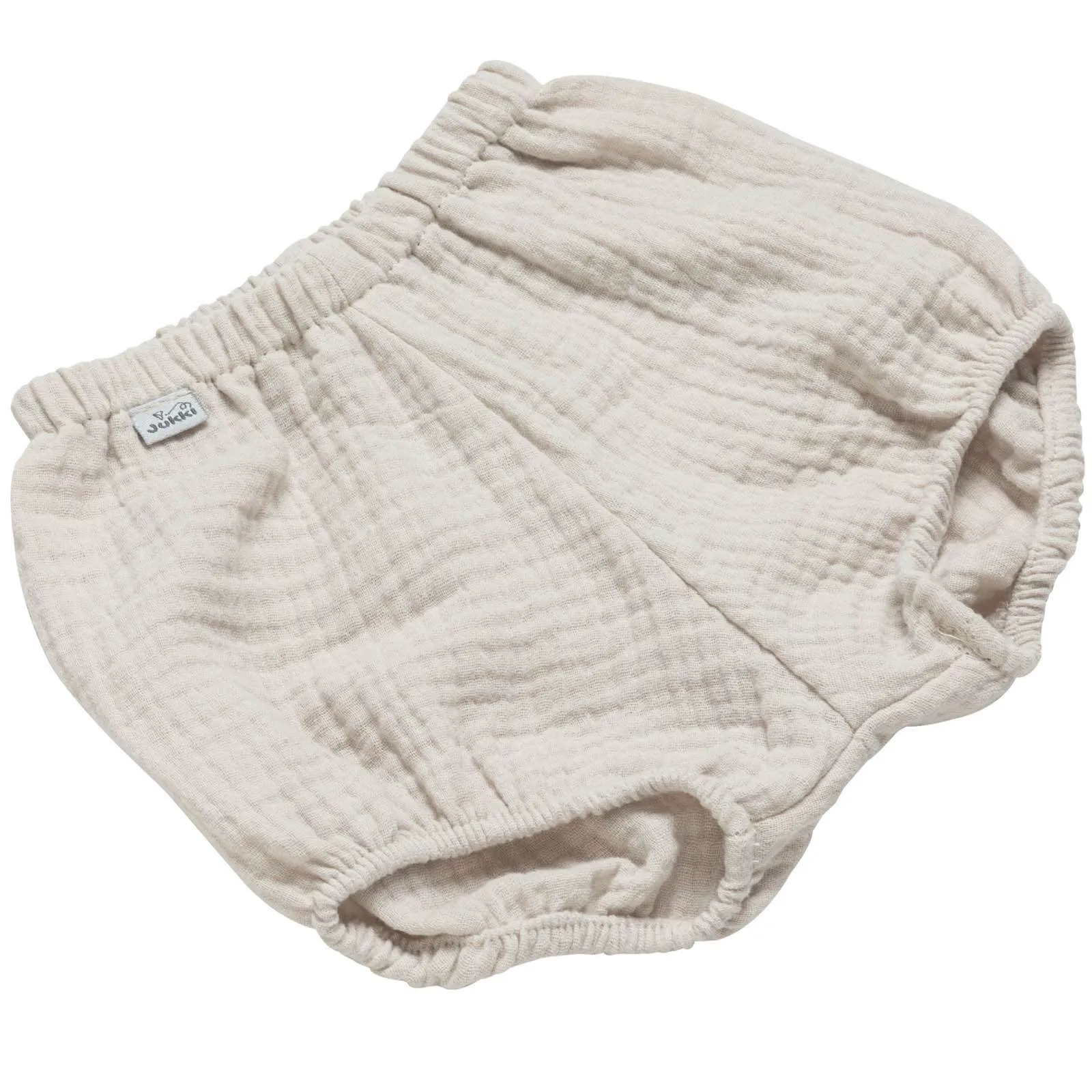 Bloomer bestehen zu 100 % aus Baumwollmusselin. Der weiche, luftige Stoff verhindert Überhitzung und liegt geschmeidig und sanft auf der Haut.