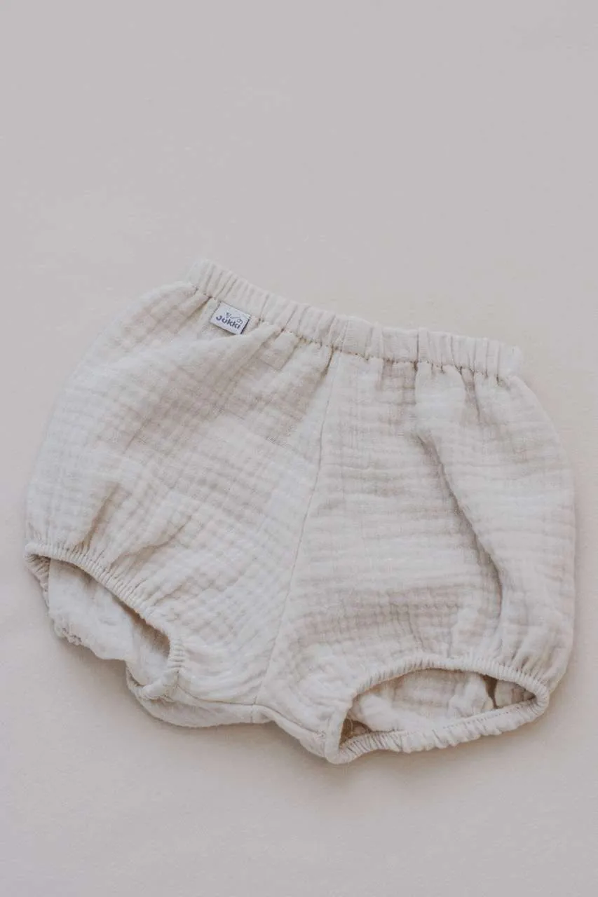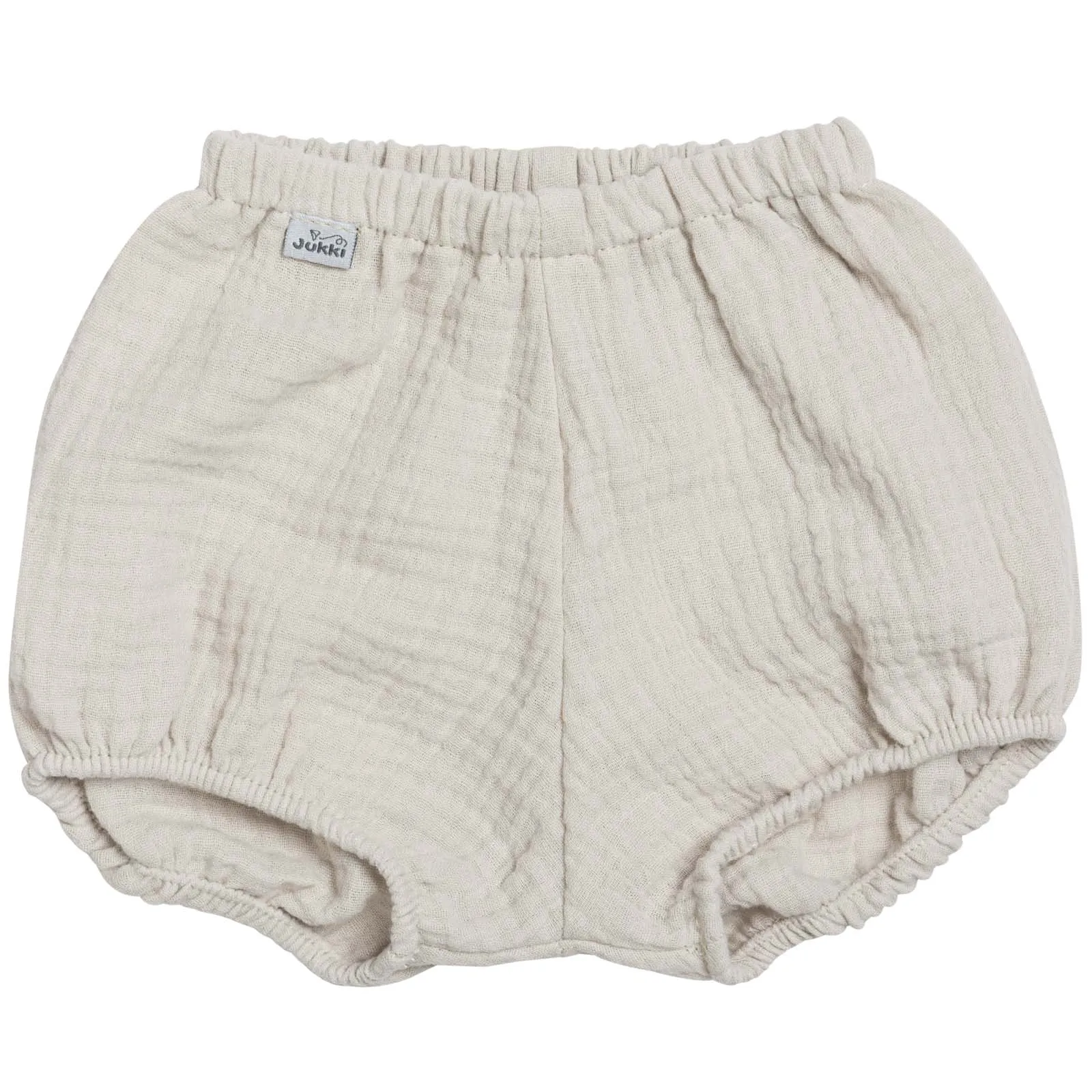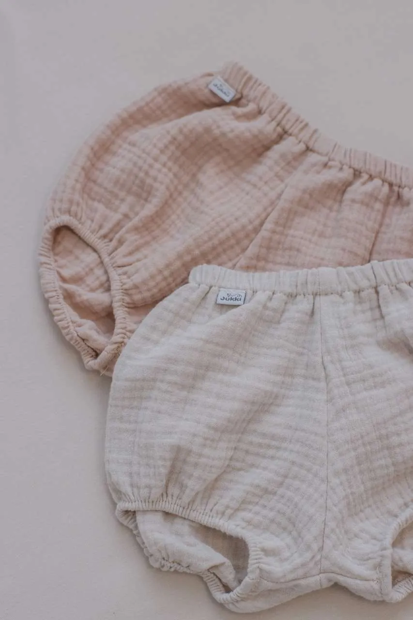 Bloomer bestehen zu 100 % aus Baumwollmusselin. Der weiche, luftige Stoff verhindert Überhitzung und liegt geschmeidig und sanft auf der Haut.