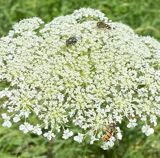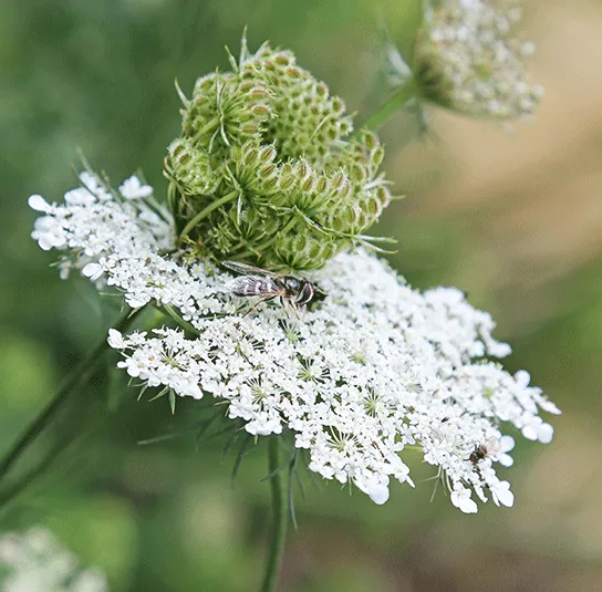 Fliegen und Käfer landen immer gerne dort, wo schon andere Artgenossen sitzen. Deshalb bezeichnet man die dunkle Möhrenblüte in der Mitte der Doldenblüte auch als Fliegenattrappe.