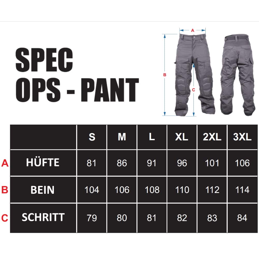 Features der Spec-Ops 2.0 Tactical Hose: – Stabieler Reisverschluss im Schritt und Klett Verschluss am Bund zum festen und sicheren halt der Hose – Hüftumfang kann stufenlos angepasst werden durch Klettverschluss – Elastisches Gewebe für optimalen Tragekomfort im Schritt, auf Hüfthöhe am Rücken, sowie vorne über den Knien – 4 aufgesetzte Taschen mit kräftigen Klettverschlüssen sowie 2 offene Taschen für Zubehör – Integrierte, flexiebele und leicht gepolosterte Kneepads / Kniepads aus sehr strapazierfähigem Material (neues, flexiebeleres Design) – Fussbereich der Hose mit Klettverschluss im Umfang stufenlos verstellbar, z.B. zum Anpassen an Kampfstiefel– Sehr leichtes und stapazierfähiges Gewebe