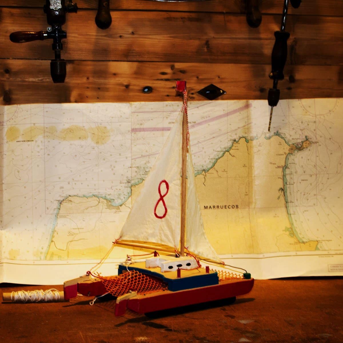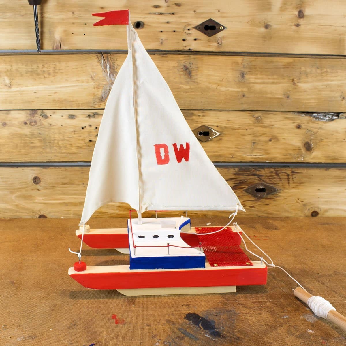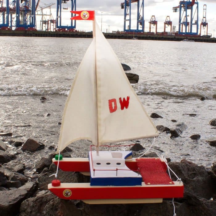 Der Katamaran, ca. 32 x 20 x 44 cm (L x B x H), kann schwimmen und bei etwas Wind sogar richtig segeln.
