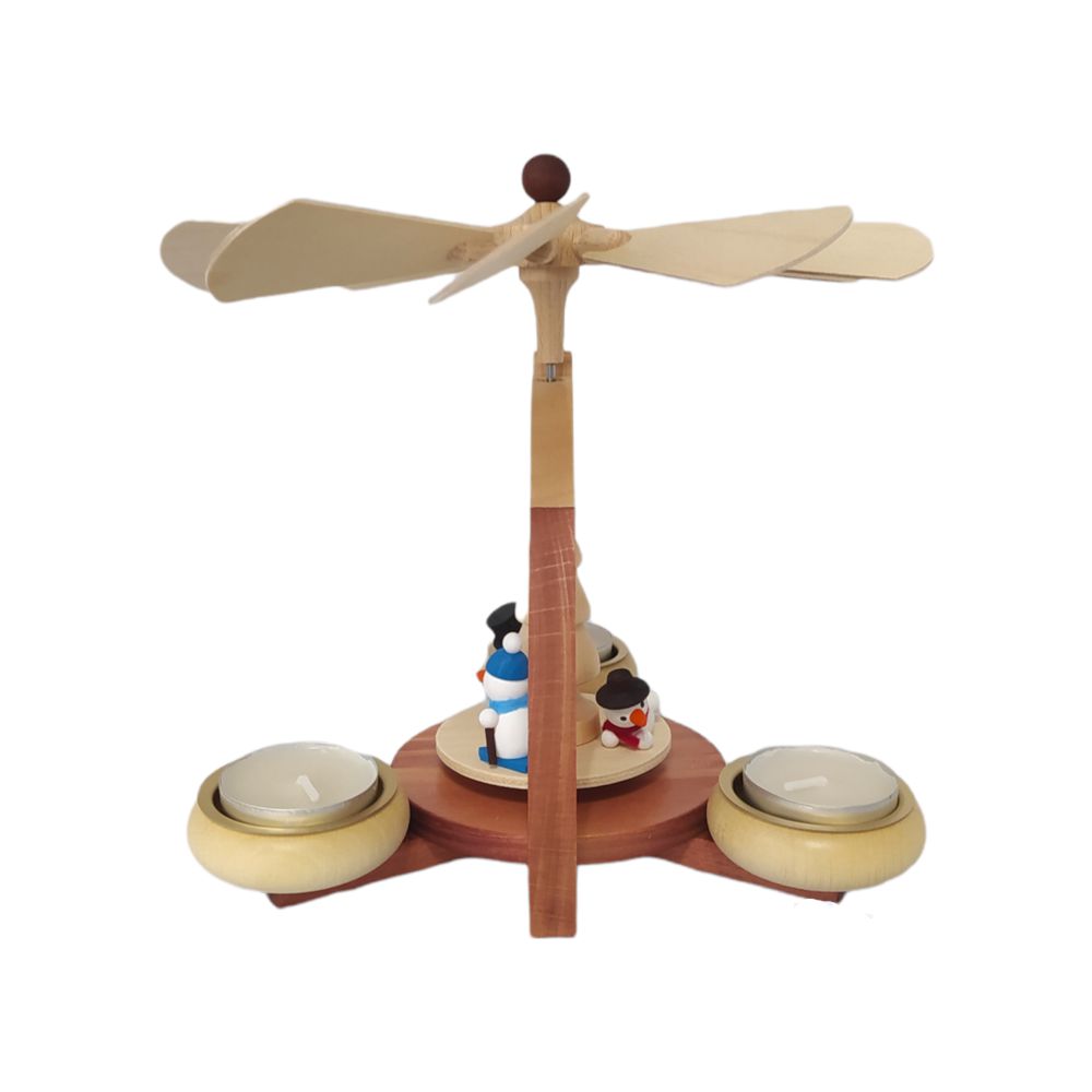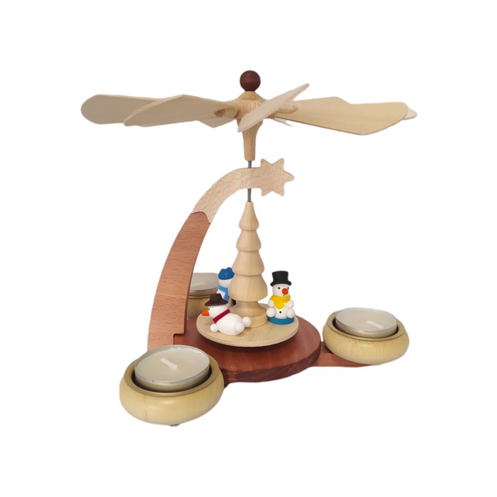 Die zentrale Achse, um die sich die fröhlichen Schneemänner mit ihren farbigen Mützen und Schals drehen, wird von handelsüblichen Teelichtern betrieben. Die aufsteigende Wärme der Kerzen setzt dabei die filigranen Figuren in Bewegung und lässt sie ihre Runden drehen, was ein faszinierendes Spiel aus Licht und Schatten erzeugt. Eine elegant geschwungene Sternschnuppe bildet den oberen Bogen dieser hübschen Pyramide und verleiht ihr eine zauberhafte und verträumte Note. Die harmonische Kombination aus traditionellen Motiven und modernem Design macht diese Teelichtpyramide zu einem besonderen Blickfang und einem zeitlosen Dekorationsstück, das die Magie der Weihnachtszeit auf stilvolle Weise in jedes Zuhause bringt.