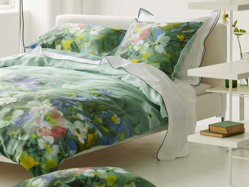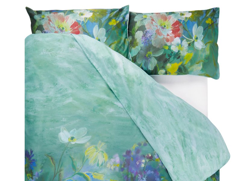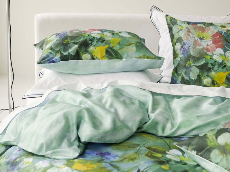 Die Bettwäsche GLADYS BLOSSOM 140×200 aus der DESIGNERS GUILD Kollektion Frühjahr Sommer 2024 zeigt ein opulentes und farbenfrohes Feld aus verschiedenen Blumenblüten auf grünem Fond. So blühen Anemonen, Gänseblümchen, Kornblumen und viele mehr auf der Frühlingswiese und schenken uns ihre wunderbaren Farben. Der grüne Hintergrund verleiht der Bettwäsche eine gewisse Tiefe, so dass wir in dieses Blumenmeer förmlich eintauchen möchten…