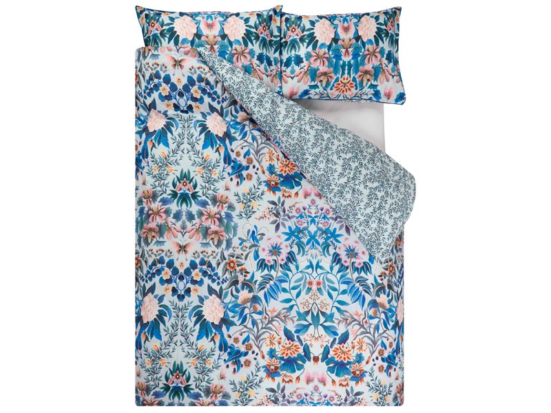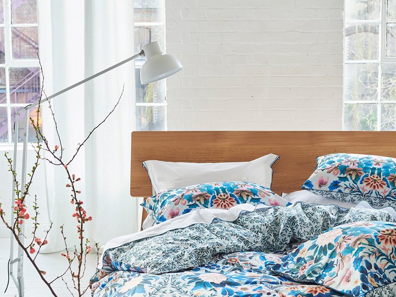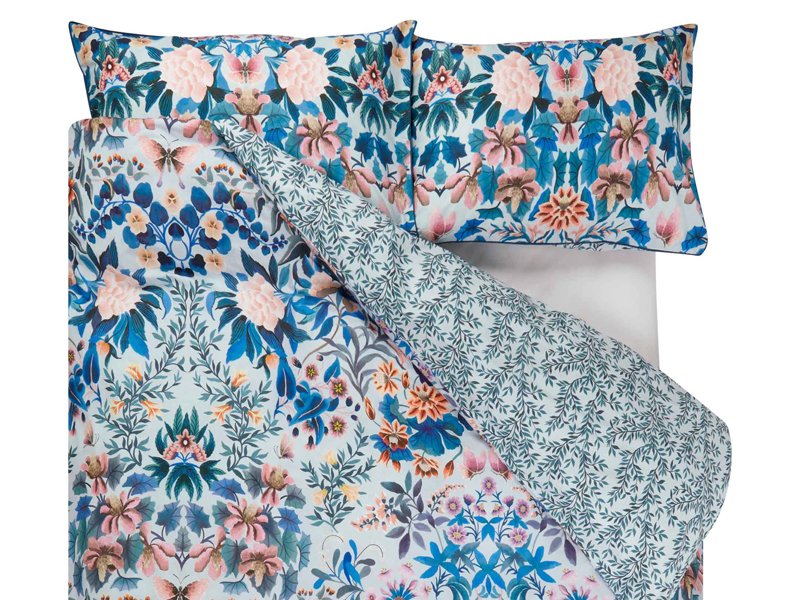 - Wendebettwäsche mit asiatisch anmutendem, floralem Muster auf der Vorderseite und Motiv von Zweigen auf der Rückseite