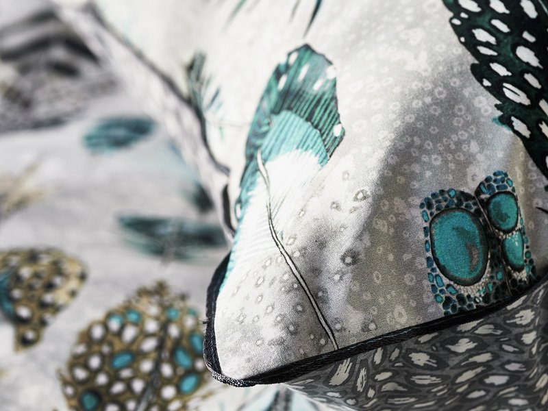 Diese auffällige Bettwäsche in feiner Perkalqualität zeigt eine Sammlung von wunderschönen Federn, detailliert illustriert, die bei QUILL COBALT sich perfekt von dem anthrazitfarbenen Fond abheben. Die zweite Farbstellung QUILL DUCK EGG zeigt sich mit einem zarten, hellgrauen Untergrund zurückhaltender, wobei die überwiegend in verschiedenen Blautönen gehaltenen Federn hier ebenso toll wirken.