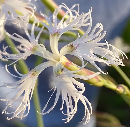 Blüte: reinweiß bis zartrosa und hell-lila, durch die tiefe Schlitzung der Blütenblätter wirkt die auffällige Blüte sehr grazil
