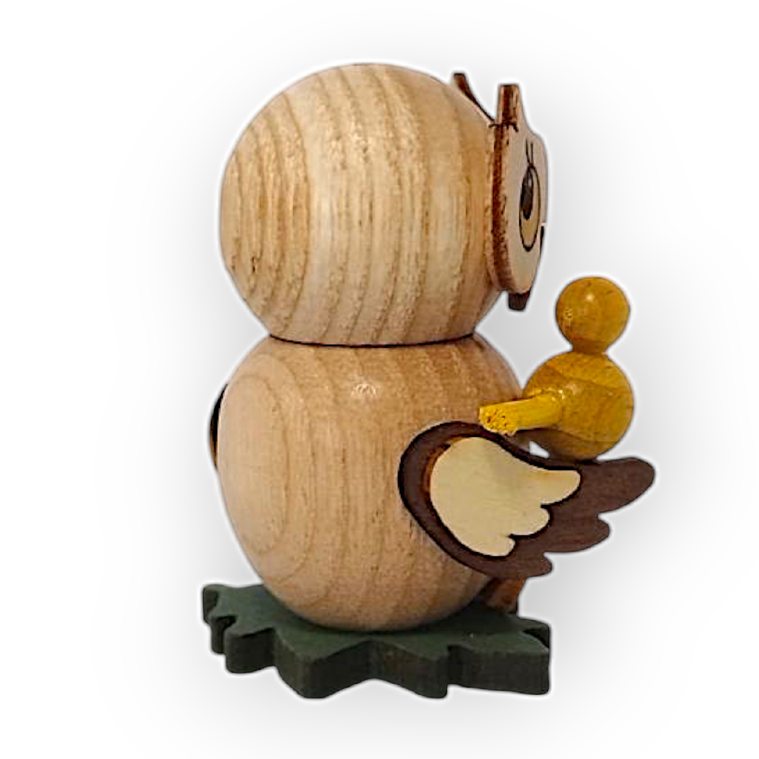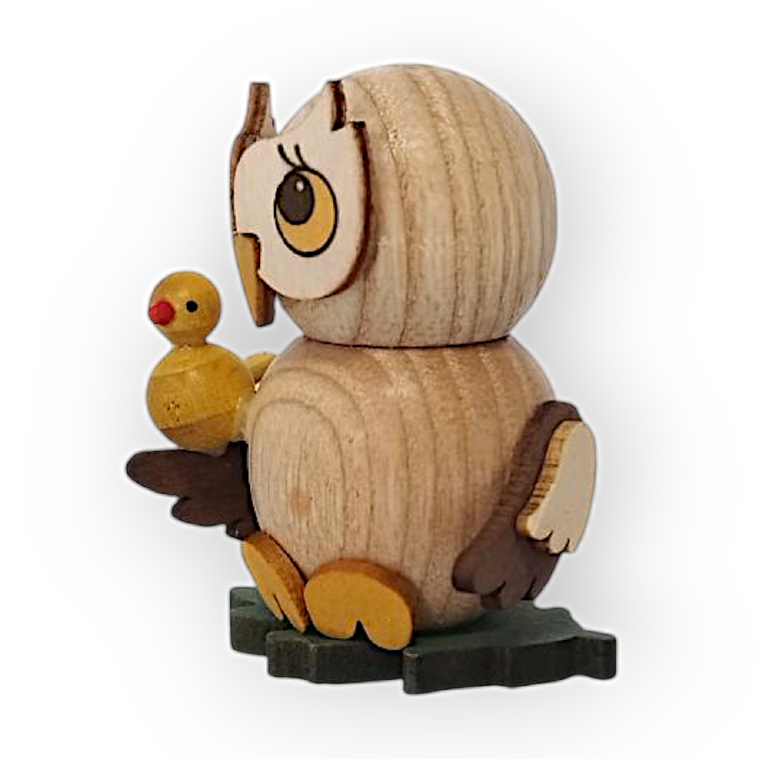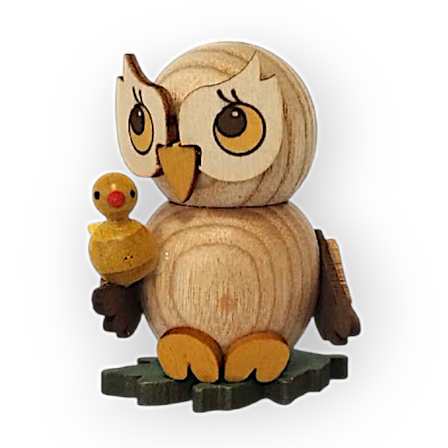 Der kleine Vogel, der auf dem Flügel der Eule sitzt, ist gelb mit einem roten Schnabel und schwarzen Augen. Er wirkt ebenso verspielt wie die Eule und passt thematisch sehr gut zur Gesamtfigur. Beide stehen auf einer kleinen grünen Basis, die vermutlich eine angedeutete Wiese darstellt.