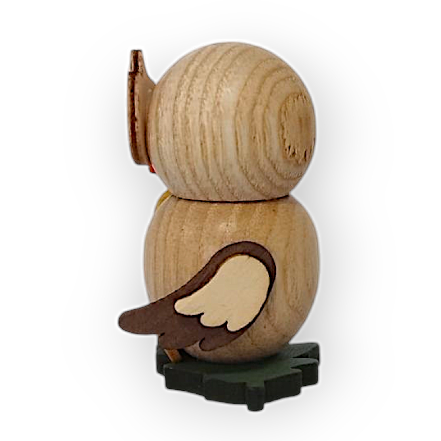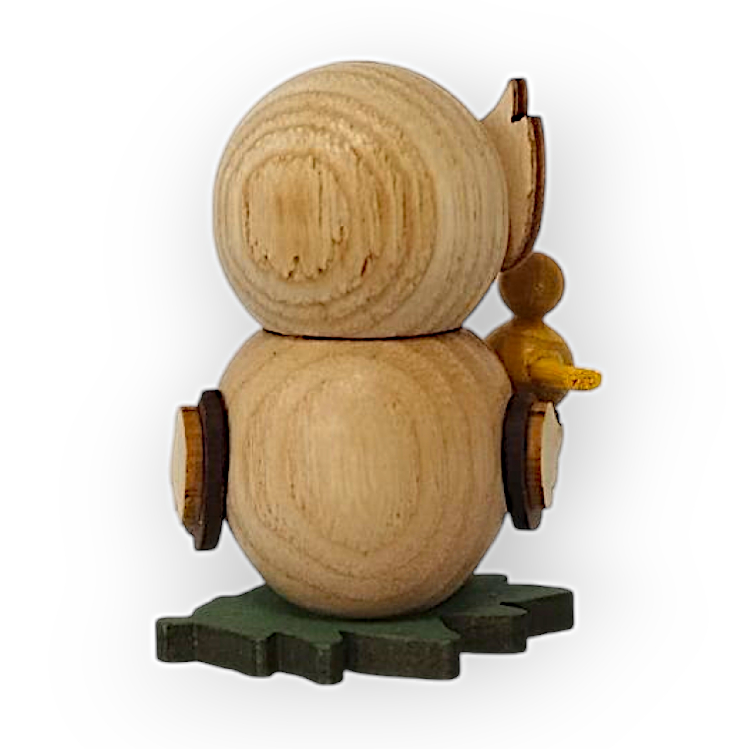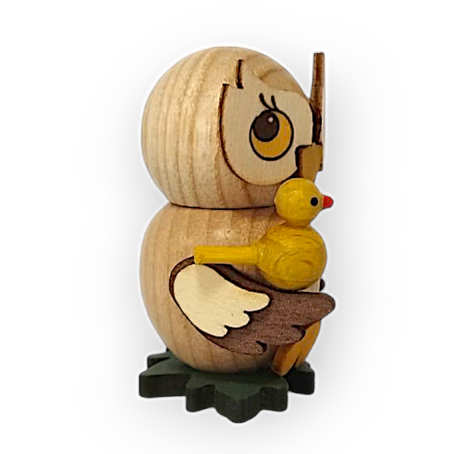 Der kleine Vogel, der auf dem Flügel der Eule sitzt, ist gelb mit einem roten Schnabel und schwarzen Augen. Er wirkt ebenso verspielt wie die Eule und passt thematisch sehr gut zur Gesamtfigur. Beide stehen auf einer kleinen grünen Basis, die vermutlich eine angedeutete Wiese darstellt.