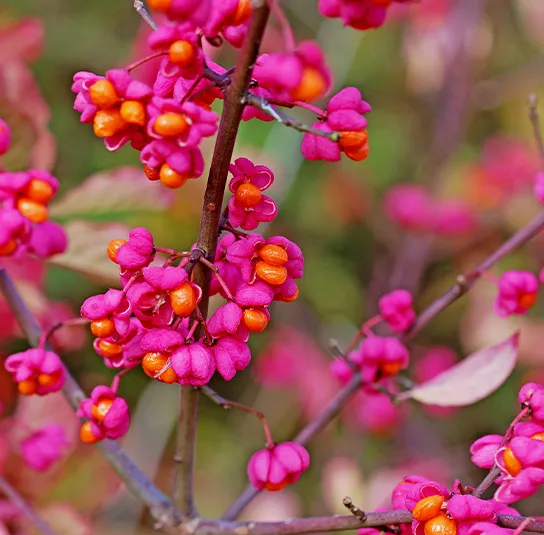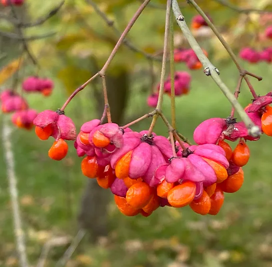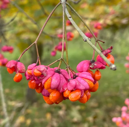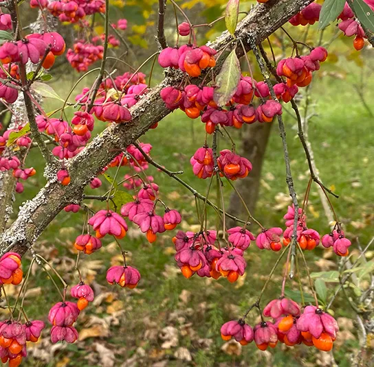 Frucht: Sehr zierend, hoch attraktiv. Rosarot bis kaminrote vierlappige Fruchtkapsel. Der leuchtend orangefarbene Samenmantel enthält bis zu vier Samen.