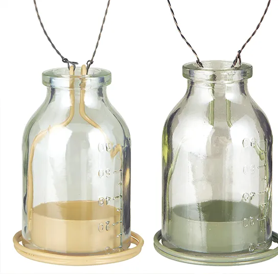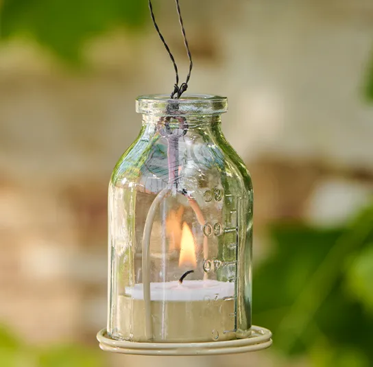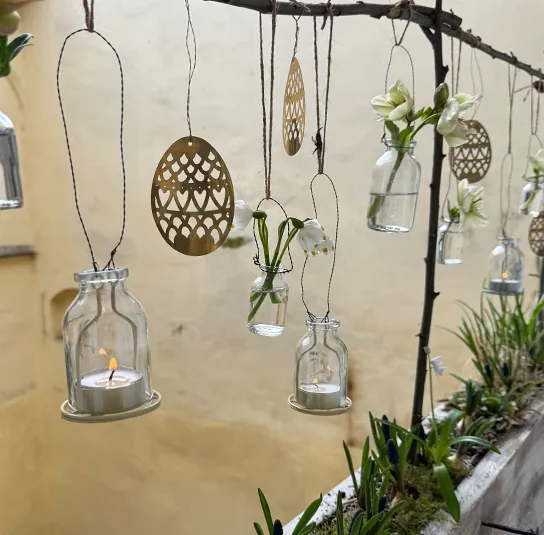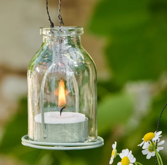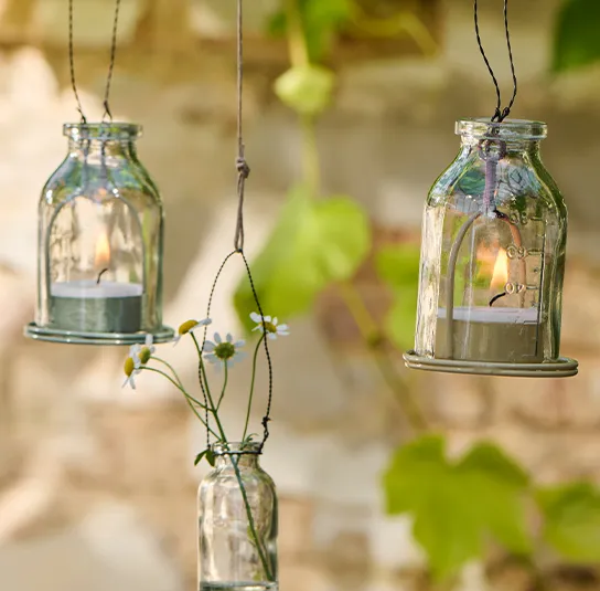 Kleine, entzückende Kerzenhalter zum Aufhängen mit einem abnehmbaren Metallfuß, in den man ein Teelicht stellen kann. Die Kerzenhalter können an einem Baum oder auf der Terrasse mit dem kleinen Metalldraht aufgehängt werden, um ein gemütliches Ambiente im Freien zu schaffen.