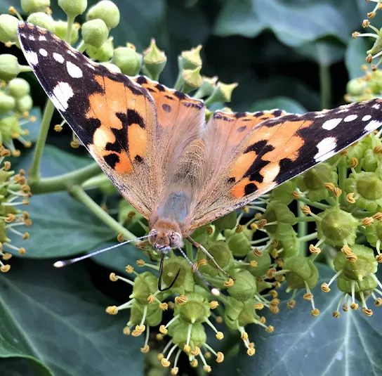 Bienen, Wespen und Schwefligen aber auch etliche Tagfalter erfreuen sich am späten Nektar- und Pollenagebot des Zwerg-Strauch-Efeus. Besonders der Admiral wird gerne an den Blüten gesichtet. Die Efeu-Seidenbiene wurde aufgrund ihrer sehr späten Flugzeit erst in jüngster Zeit als eigenständige Art beschrieben (Ende 20 Jhdt.). Die Efeu-Seidenbiene weist eine starke Spezialisierung auf den Efeu-Pollen als Nahrungsquelle für ihre Larven auf.[/vc_column_text][/vc_tta_section][/vc_tta_accordion][/vc_column][/vc_row][vc_row][vc_column][vc_column_text text_larger=“no“]