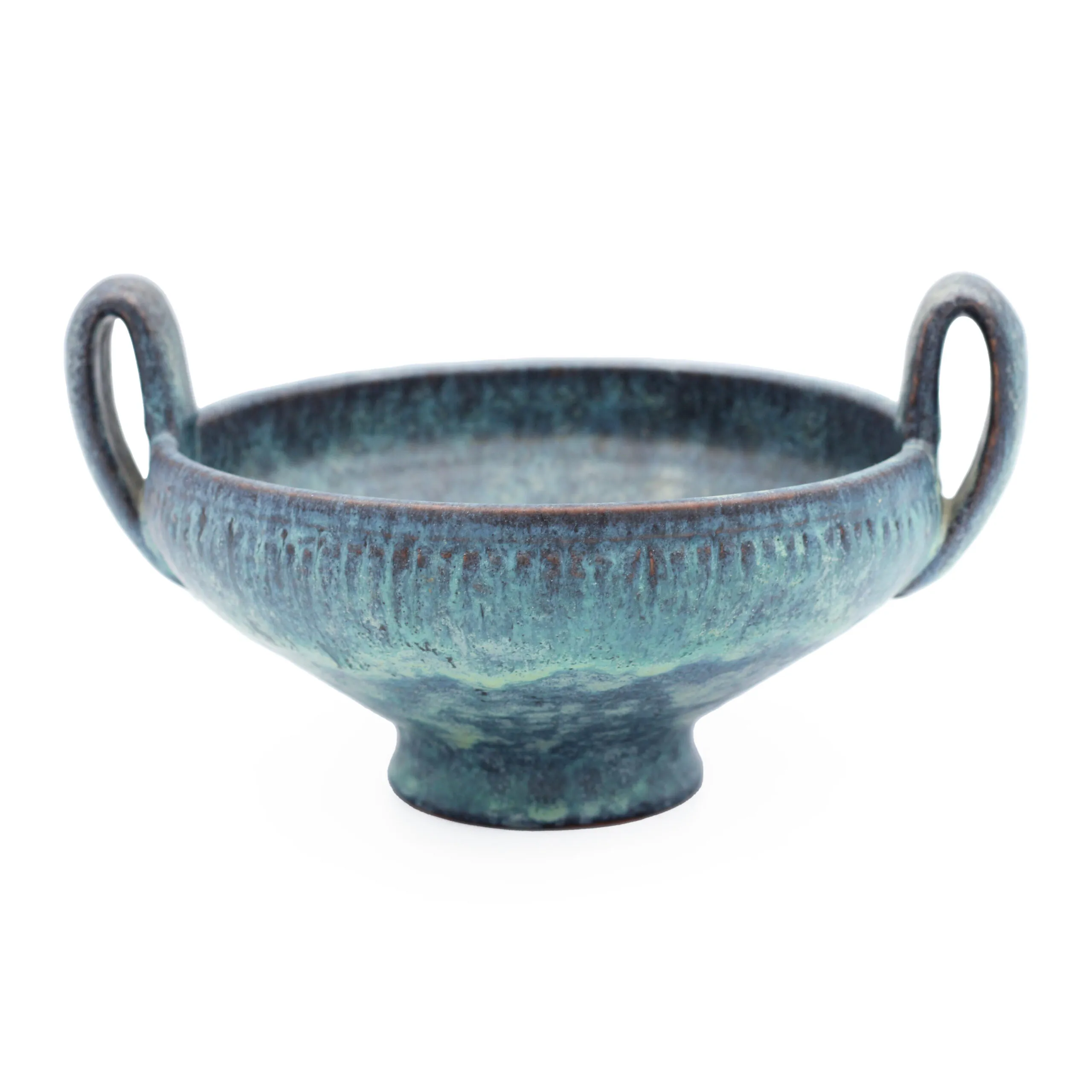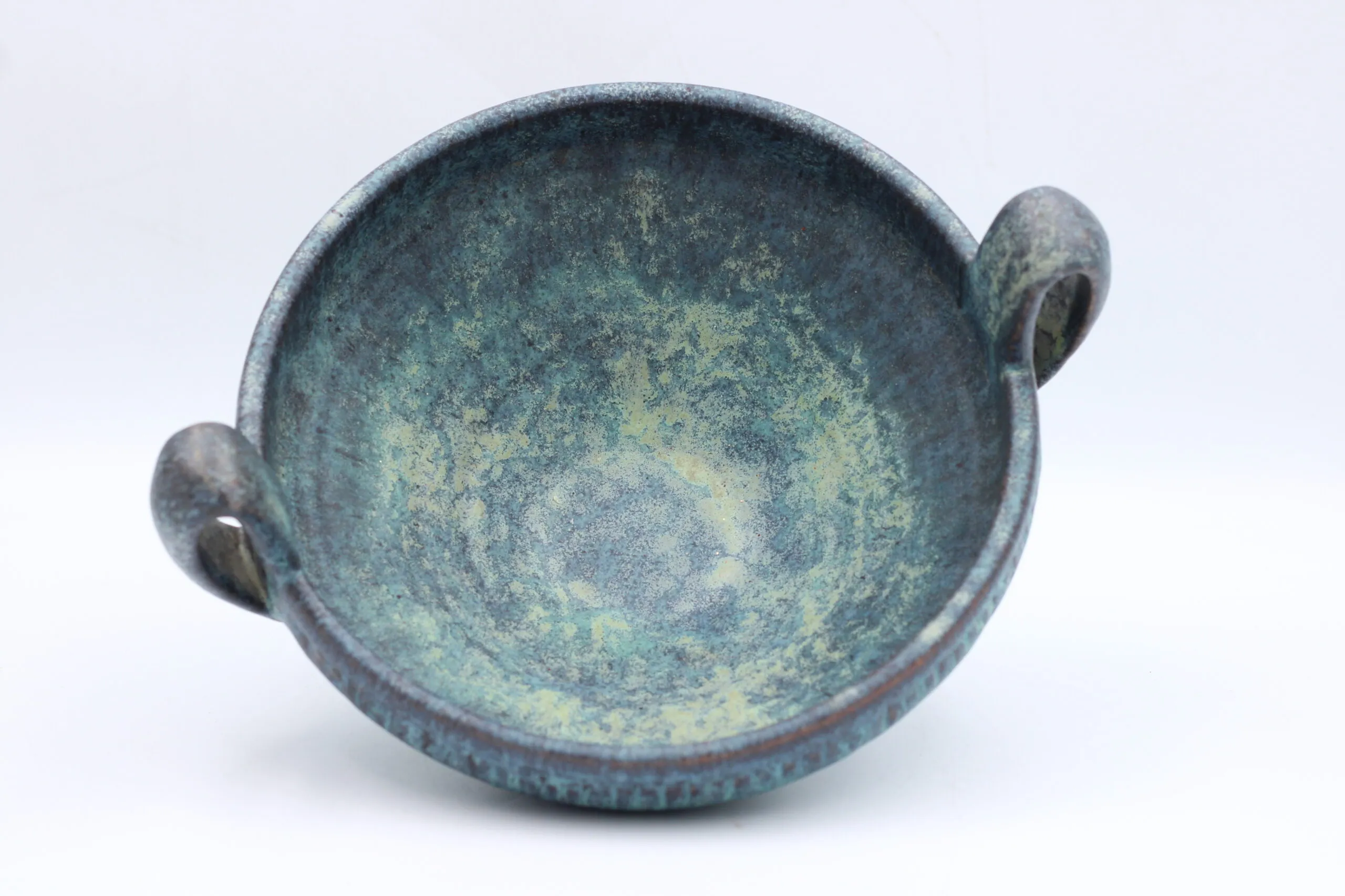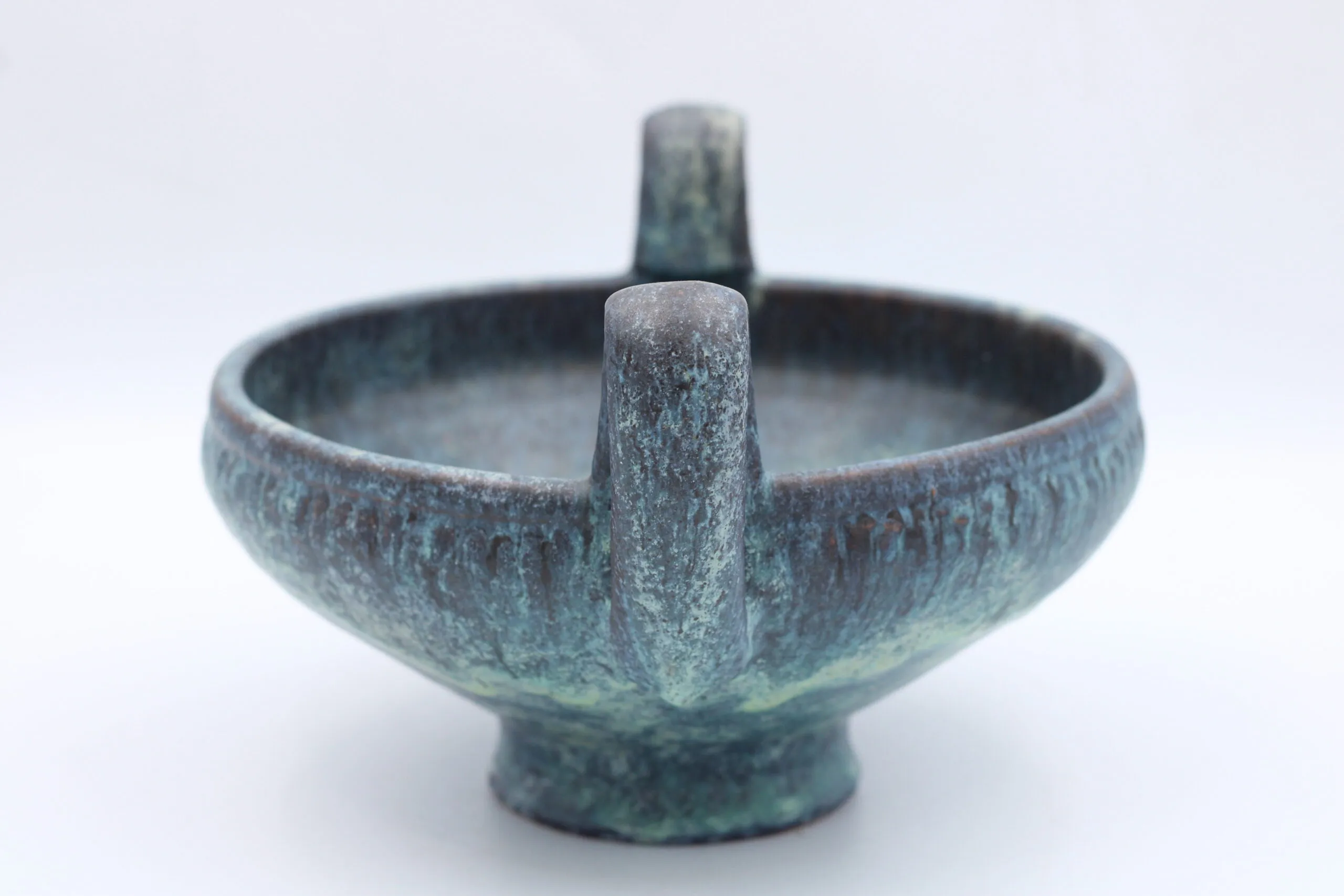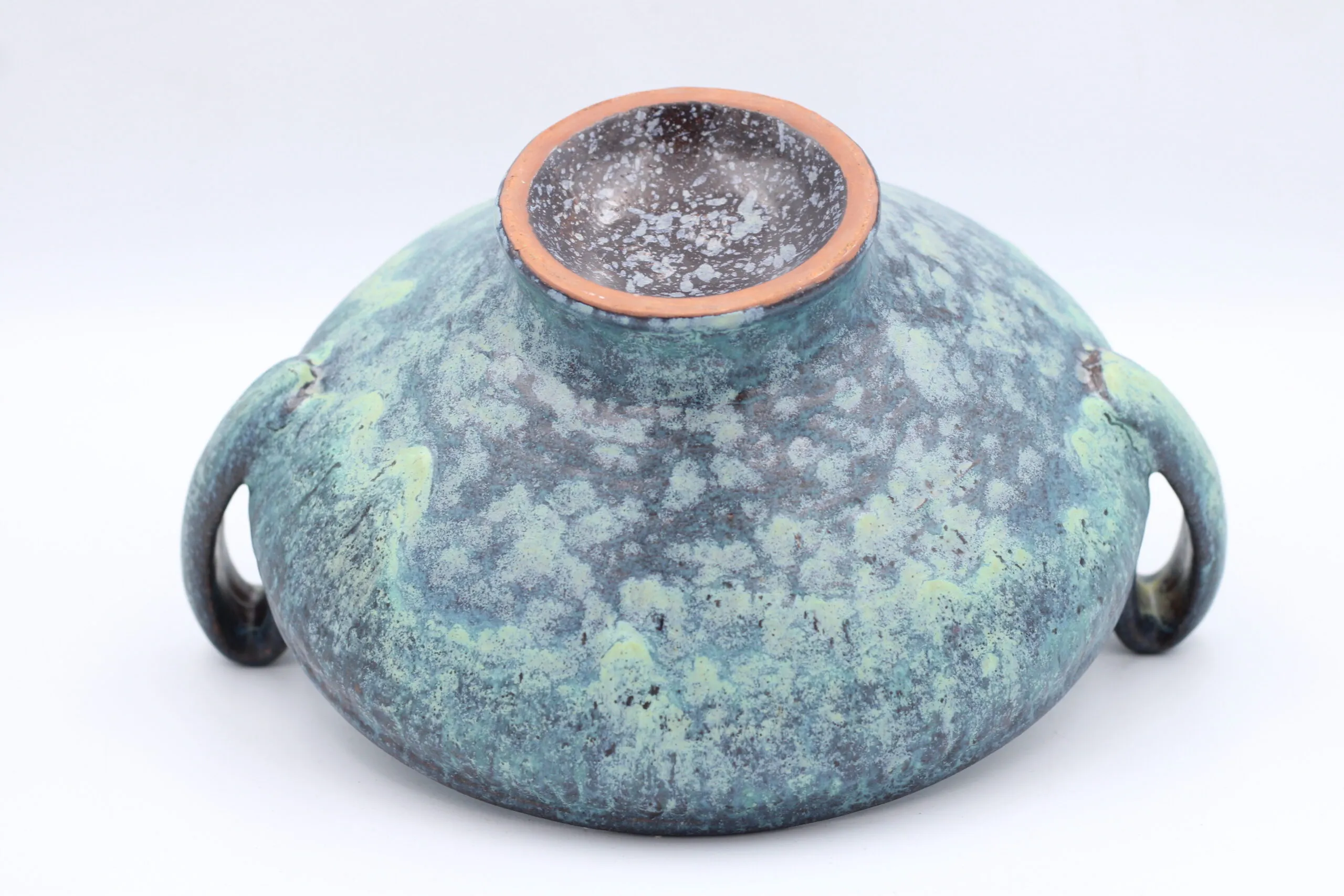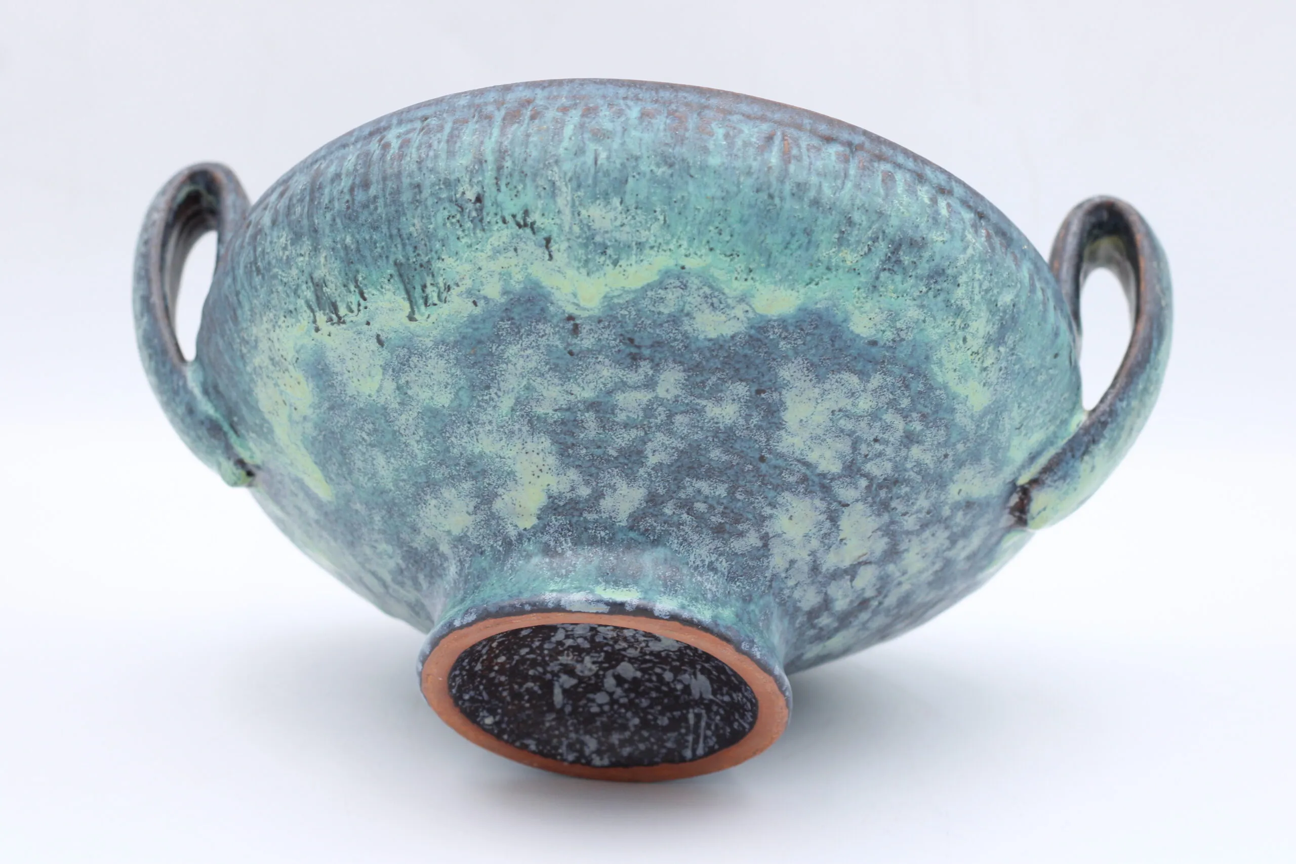 Angeboten wird eine Obstschale aus Keramik mit Griffen des Herstellers Karlsruher Majolika.