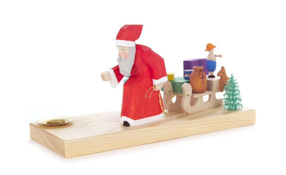 Dieser handgeschnitzte Kerzenhalter Weihnachtsmann mit Schlitten,