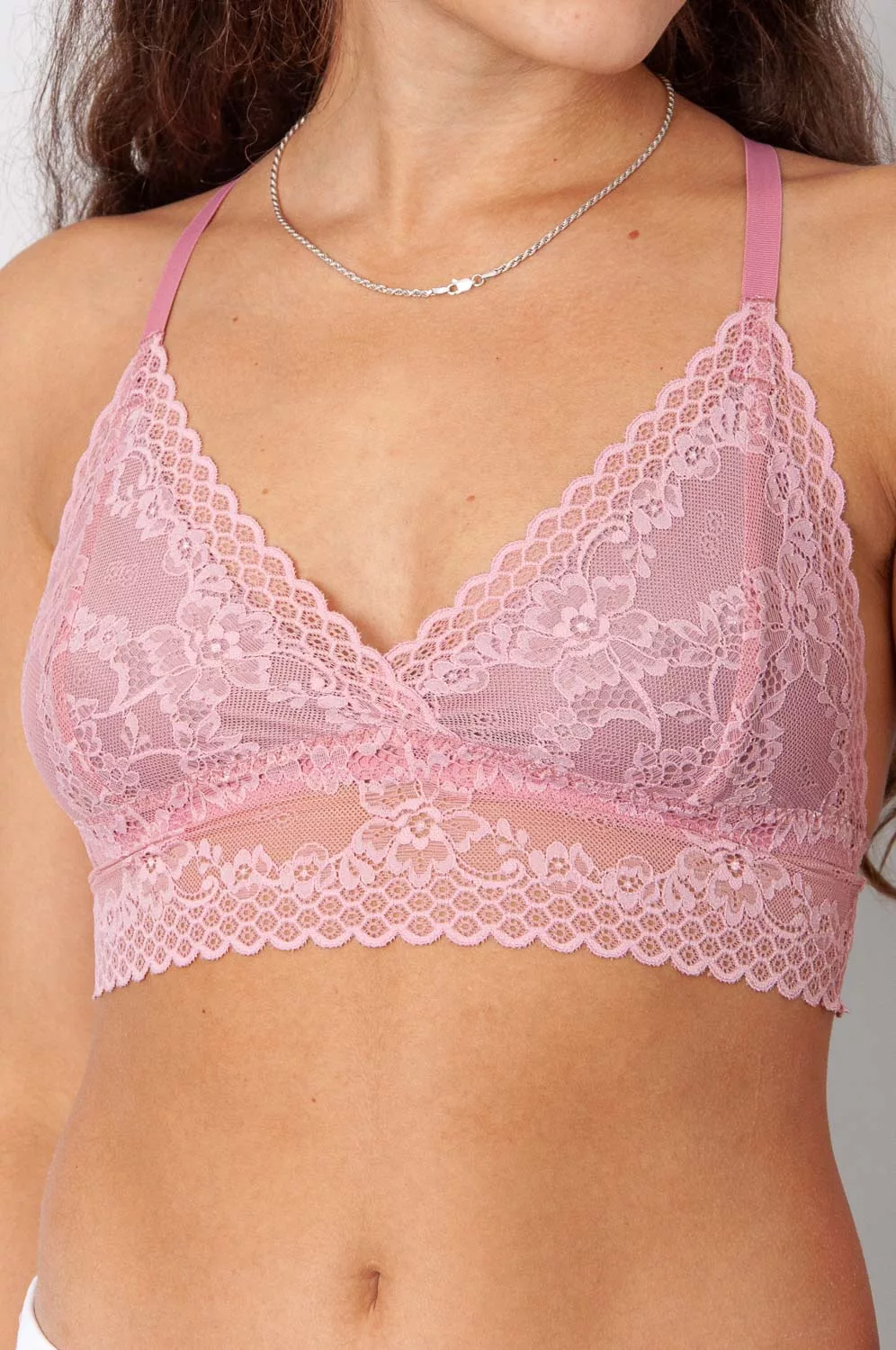Dieses Bralette ist schon fast ein super schönes, sinnliches Top, da es unten etwas länger geschnitten ist. Es hat keinen Verschluss, wird also durch simples Hineinschlüpfen angezogen – aber keine Sorge, das Material ist sehr dehnbar. Die Cups des BHs sind mit rosa Jersey unterlegt und somit blickdicht. Super besonders an Sophia ist außerdem die Rückenlösung: schön und mit süßem mit Cut-Out! Die Spitze ist aus recycelten Fasern.
