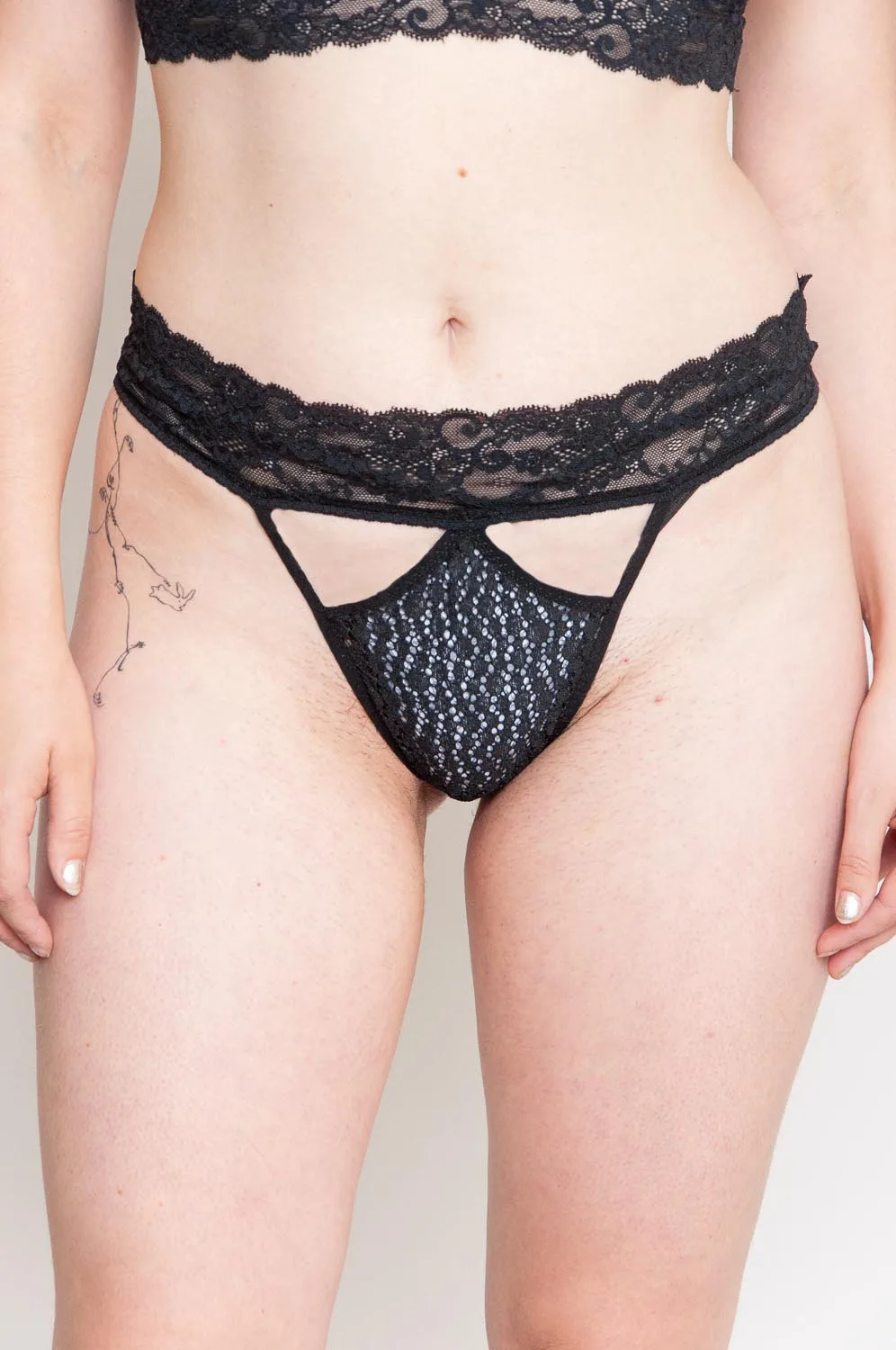 Dieses wunderschöne Höschen ist die perfekte Kombination zum Bralette Flora, da es aus ähnlichen Elementen besteht. Es besteht aus wunderschöner, geometrischer Spitze und hat vorne zwei raffinierte Cut-Outs. Den Abschluss bildet ein weiches Spitzenband.