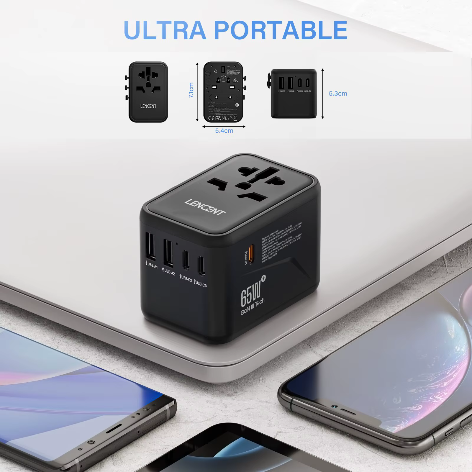 Lenzent 65W Gan Universal-Reise adapter mit 1USB Dual-Typ-C-PC 3,0 All-in-One-Reise ladegerät eu/uk/usa/aus-Stecker für Reisen