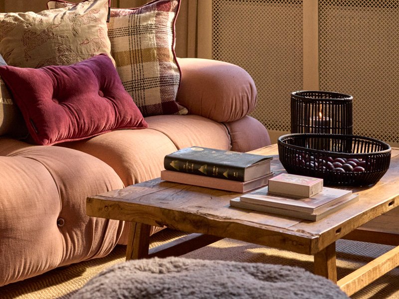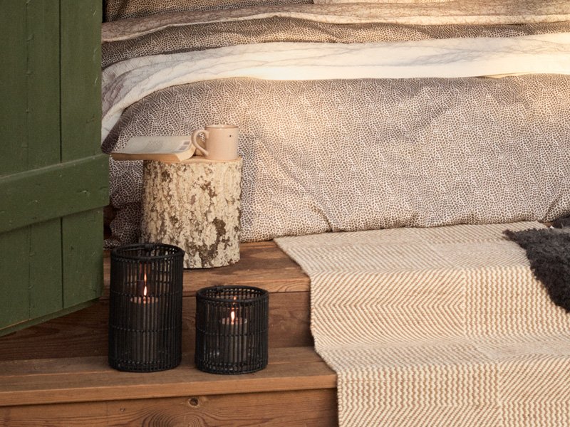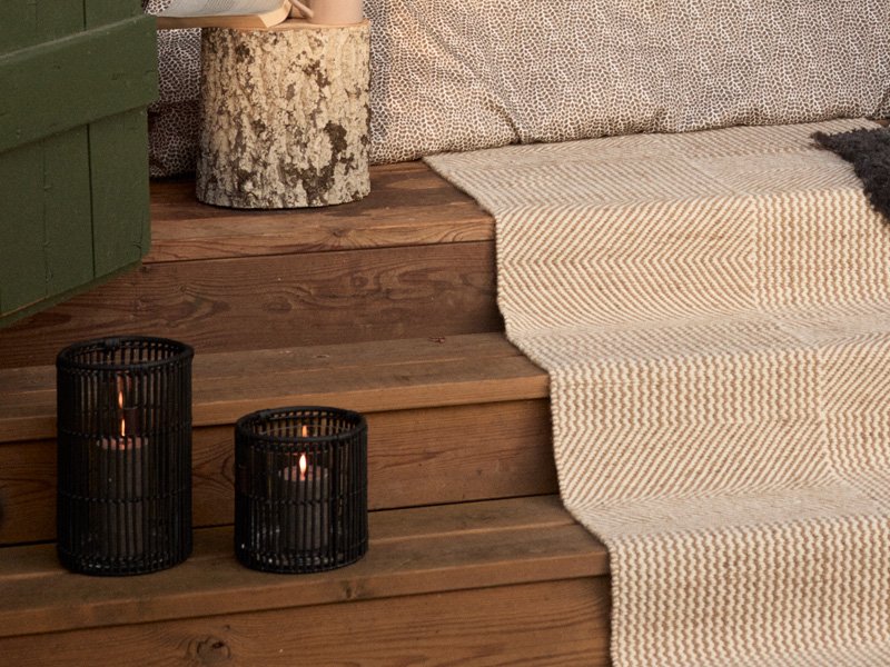 Das niedrige Windlicht lässt sich wunderbar mit seiner größeren Schwester oder dem formschönen Feuerholzkorb kombinieren.