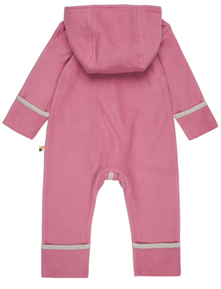 Overall mit Kapuze aus weichem Baumwoll-Fleece. Die Kapuze ist innen mit bedrucktem Jersey abgefüttert. Vorne mit Reißverschluß, innen mit Abdeckung und Reißverschluß-Garage am Halsloch. Angeschnittene Handschuhe und Füßlinge zum Umklappen. Logo-Etikett mit Fähnchen an der Seitennaht. Made in Portugal. Waschbar bei 30°C.