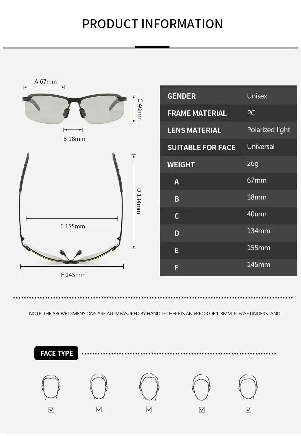 Maße: Rahmenbreite 142 mm | Glashöhe 38 mm | Glasbreite 65 mm | Nasensteg 17 mm | Bügellänge 139 mm