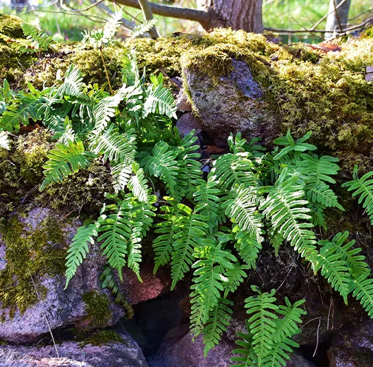 In den Allgäuer Alpen steigt der Gewöhnliche Tüpfelfarn in Vorarlberg bis zu 2100 m Meereshöhe auf.[/vc_column_text][/vc_tta_section][vc_tta_section title=“Kombination“ tab_id=“1645258159995-797629e3-ff5b“][vc_column_text text_larger=“no“]Saure Waldstandorte sind eigentlich von Natur aus artenarm. Unsere auffälligen Blütenstauden fehlen im Großen und Ganzen. Dennoch gibt es einige Arten, die sehr gut im Lebensraum Wald zu diesem Farn passen: Schneesimse (Luzula nivea), Waldgeißbart, Lungenkraut, Maiglöckchen, Vielblütiges Salomonsiegel, Leberblümchen [/vc_column_text][/vc_tta_section][vc_tta_section title=“Anwendungen“ tab_id=“1645258158503-80bed753-bc12″][vc_column_text text_larger=“no“]Früher wurde der Wurzelstock medizinisch verwendet. Als auswurfsförderndes Mittel bei Husten und Heiserkeit. Die enthaltenen Schleim- und Bitterstoffe und das süßlich schmeckende Osladin. Denn die bisweilen dick-knolligen Rhizome haben durch hohe Anteile verschiedener natürlicher Zuckerarten einen süßen Geschmack, worauf auch der alte deutsche Name „das Engelsüß“ hindeutet.[/vc_column_text][/vc_tta_section][/vc_tta_accordion][/vc_column][/vc_row][vc_row][vc_column][vc_column_text text_larger=“no“]