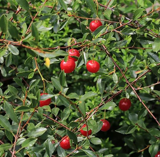 Frucht: kugelig, scharlachrot, ca. 1 cm Durchmesser, vollreif essbar, meist herb-säuerlich, manchmal auch süßlich. Fruchtreife in der zweiten Julihälfte.