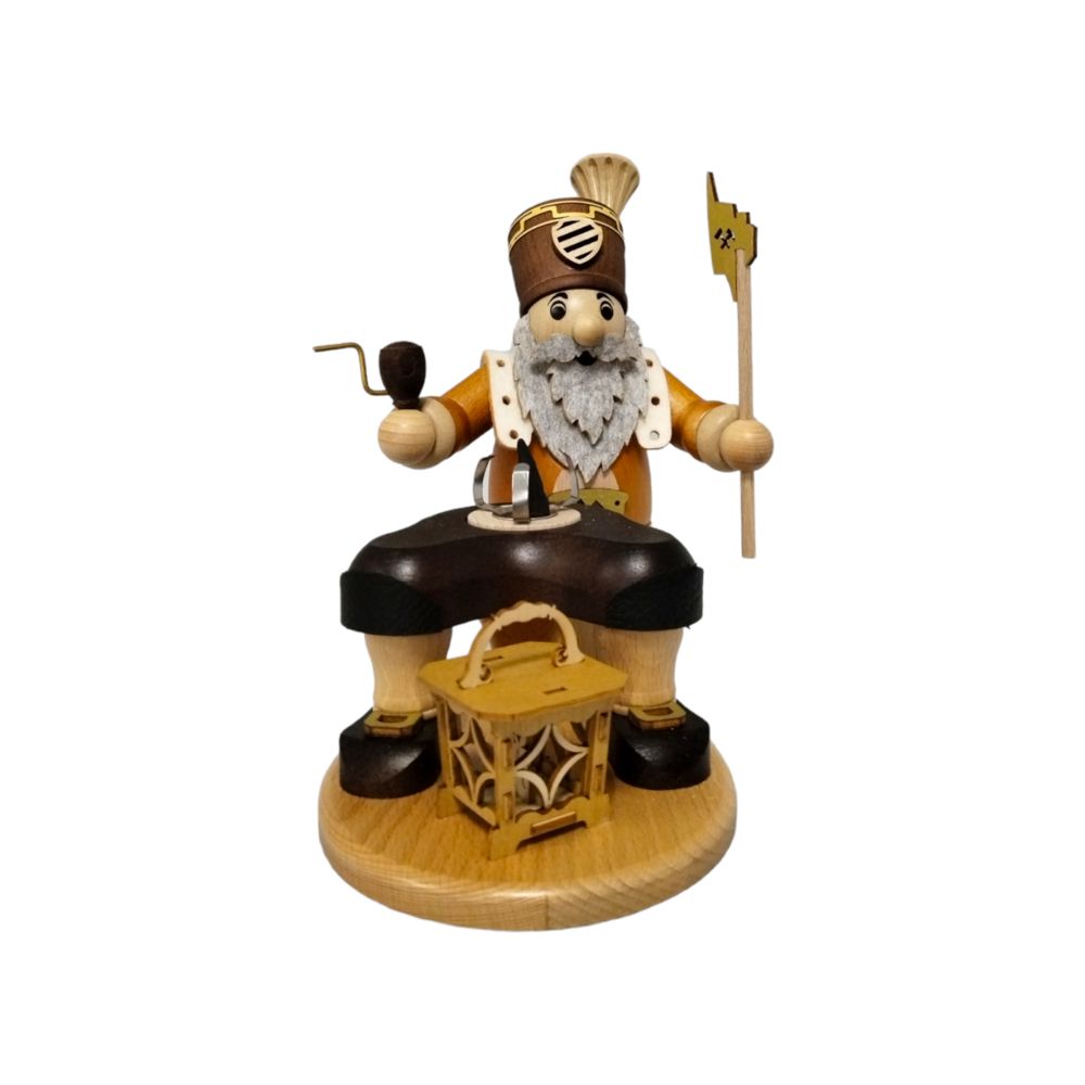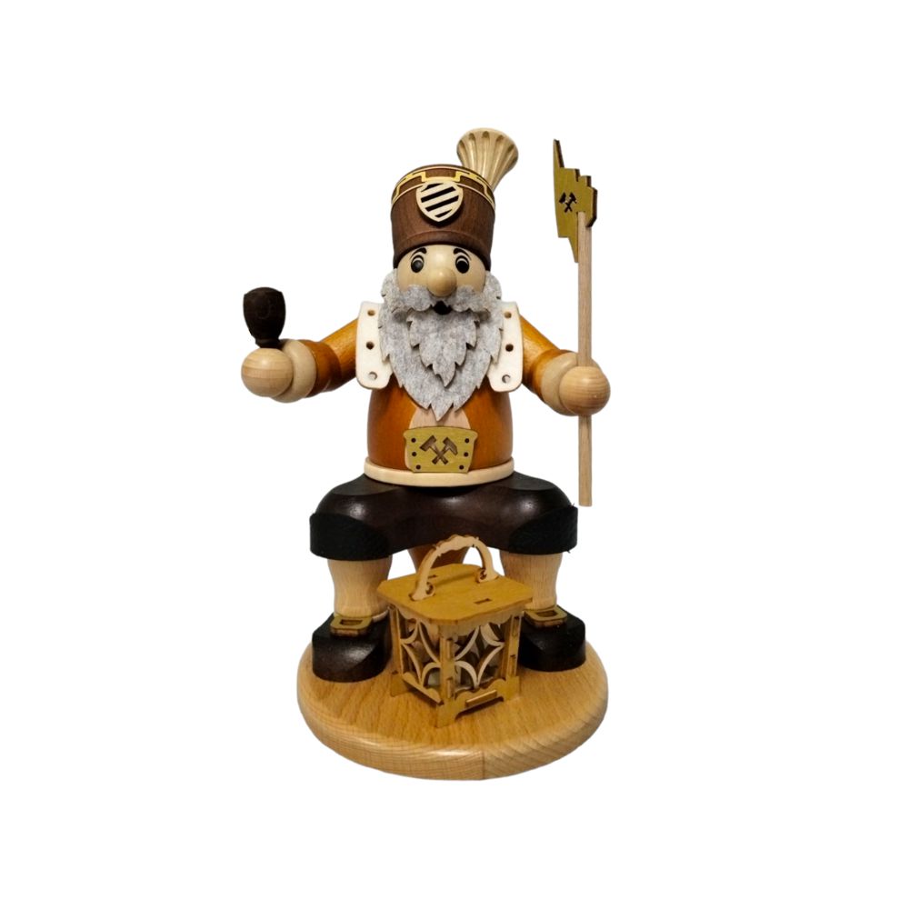 Schick in Uniform und mit Laterne sitzt dieser ganz in Natur-Tönen gehaltene Bergmann auf einem Hocker, vor ihm steht eine große Laterne. Das freundliche Gesicht mit den großen Augen, der runden Knollennase sowie dem langen Vollbart wird von einem typischen Bergmannshut auf dem Kopf geschmückt. Wie es sich für einen guten Räuchermann gehört har´t der bergmann selbstverständlich eine Pfeife in der Hand.