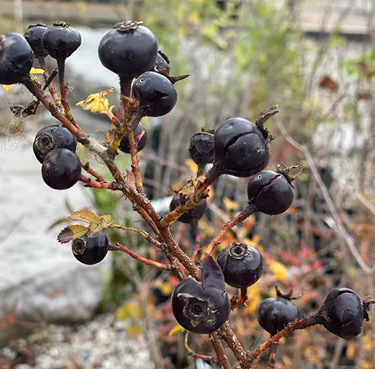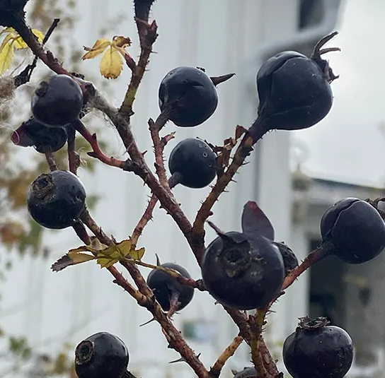 Hagebutten: Schwarz bis purpurschwarz glänzende Hagebutte, kugelig, ca. 1-1,5 cm dick