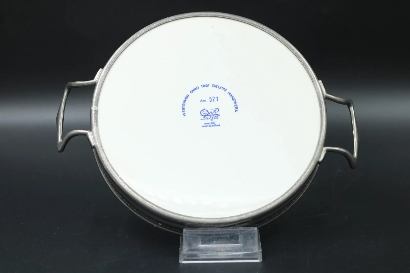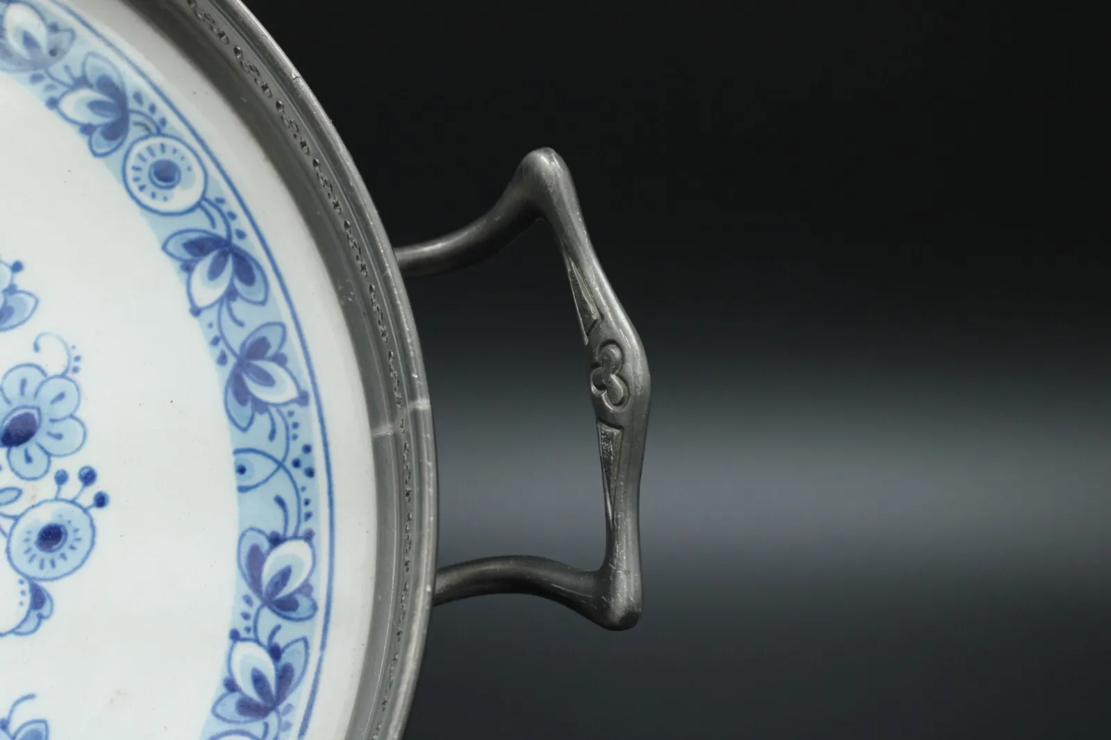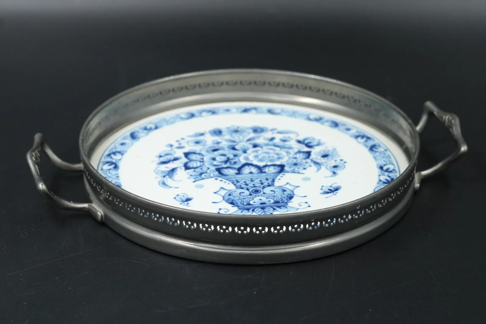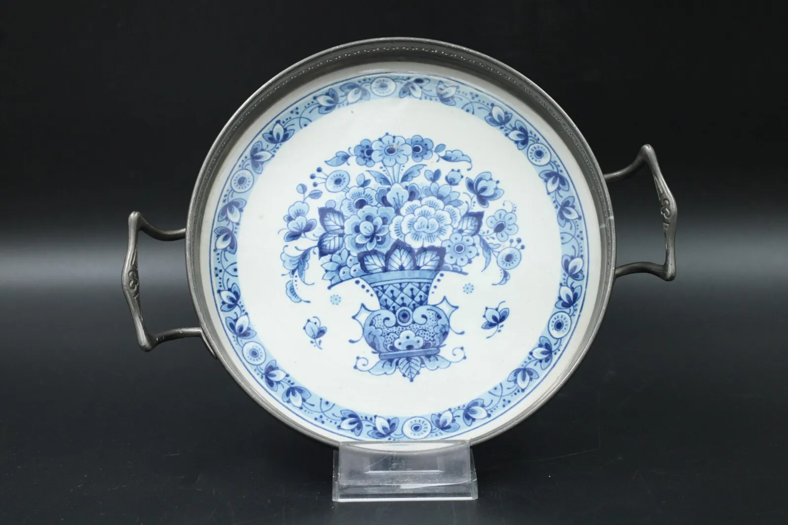 Angeboten wird ein Serviertablett aus Porzellan mit Zinnrand und Griffen